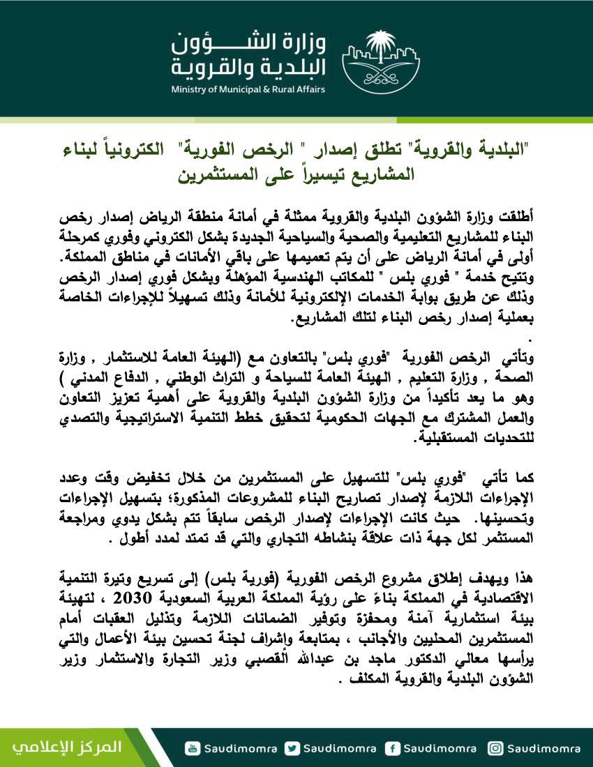 وزارة الشؤون البلدية والقروية V Twitter وزارة الشؤون البلدية والقروية تطلق إصدار رخص البناء للمشاريع التعليمية والصحية والسياحية الجديدة بشكل الكتروني وفوري كمرحلة أولى في أمانة الرياض على أن يتم تعميمها على باقي الأمانات في