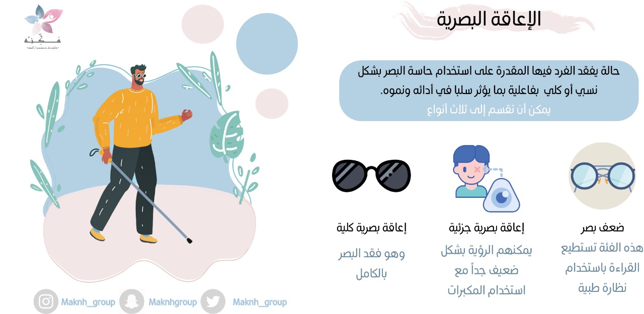 مجموعة م ك ن ه التطوعية On Twitter وحتى يسهل فهم الإعاقة البصرية يمكن أن تقسم إلى ثلاث أنواع ١ ضعف البصر هذه الفئة تستطيع القراءة باستخدام نظارة طبية ٢ إعاقة بصرية جزئية يمكنهم الرؤية