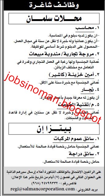 محلات سلمان بيتزا ان وظائف شاغرة فى سلطنة عمان