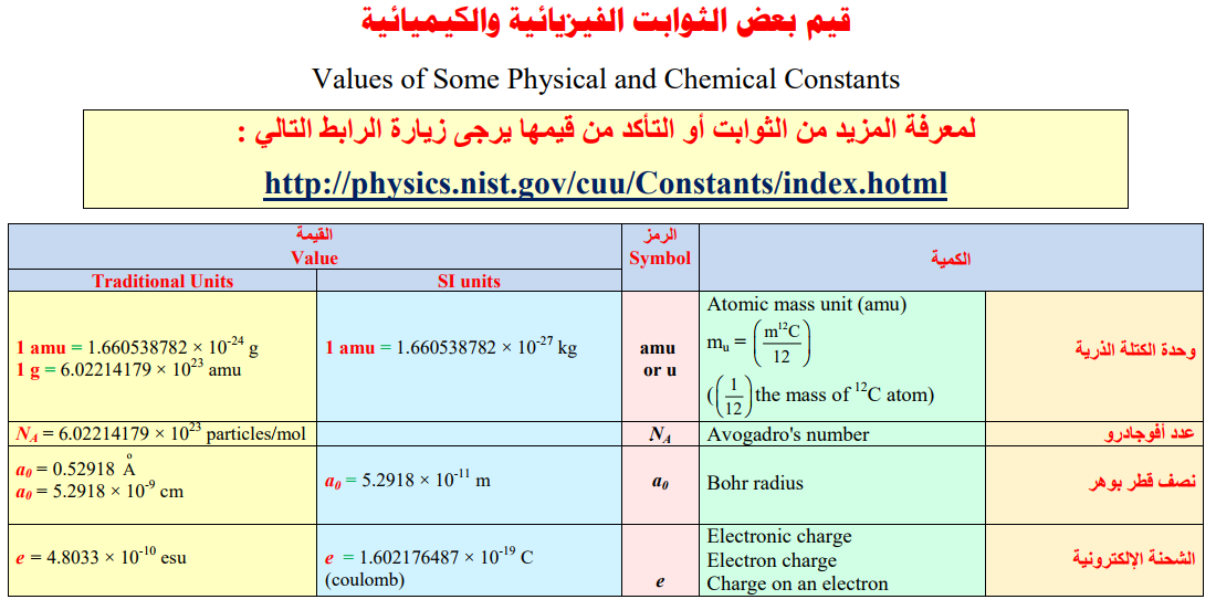 قيم بعض الثوابت الفيزيائية والكيميائية مصطلحات كيميائية