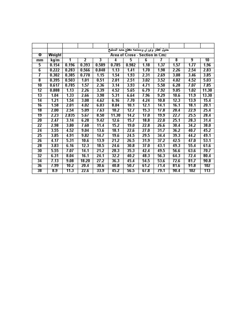 جدول أقطار وأوزان ومساحة مقطع حديد التسليح