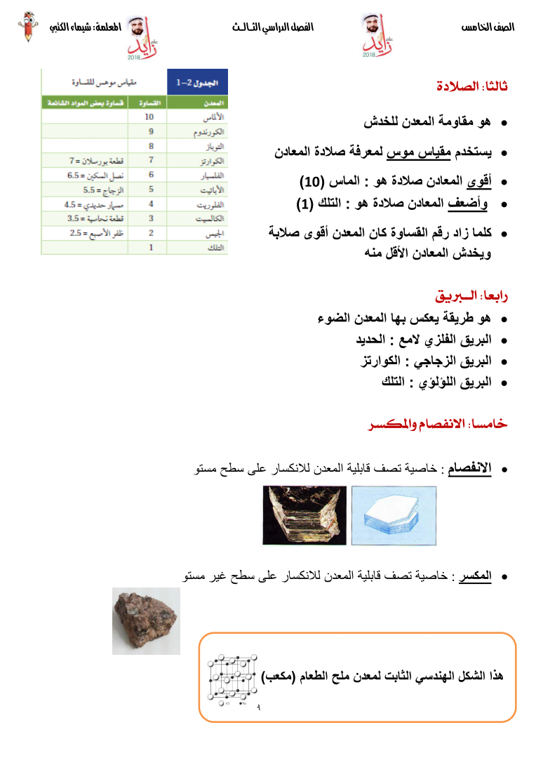 ملخص المعادن والصخور والتربة علوم صف خامس فصل ثالث مدرستي الامارتية