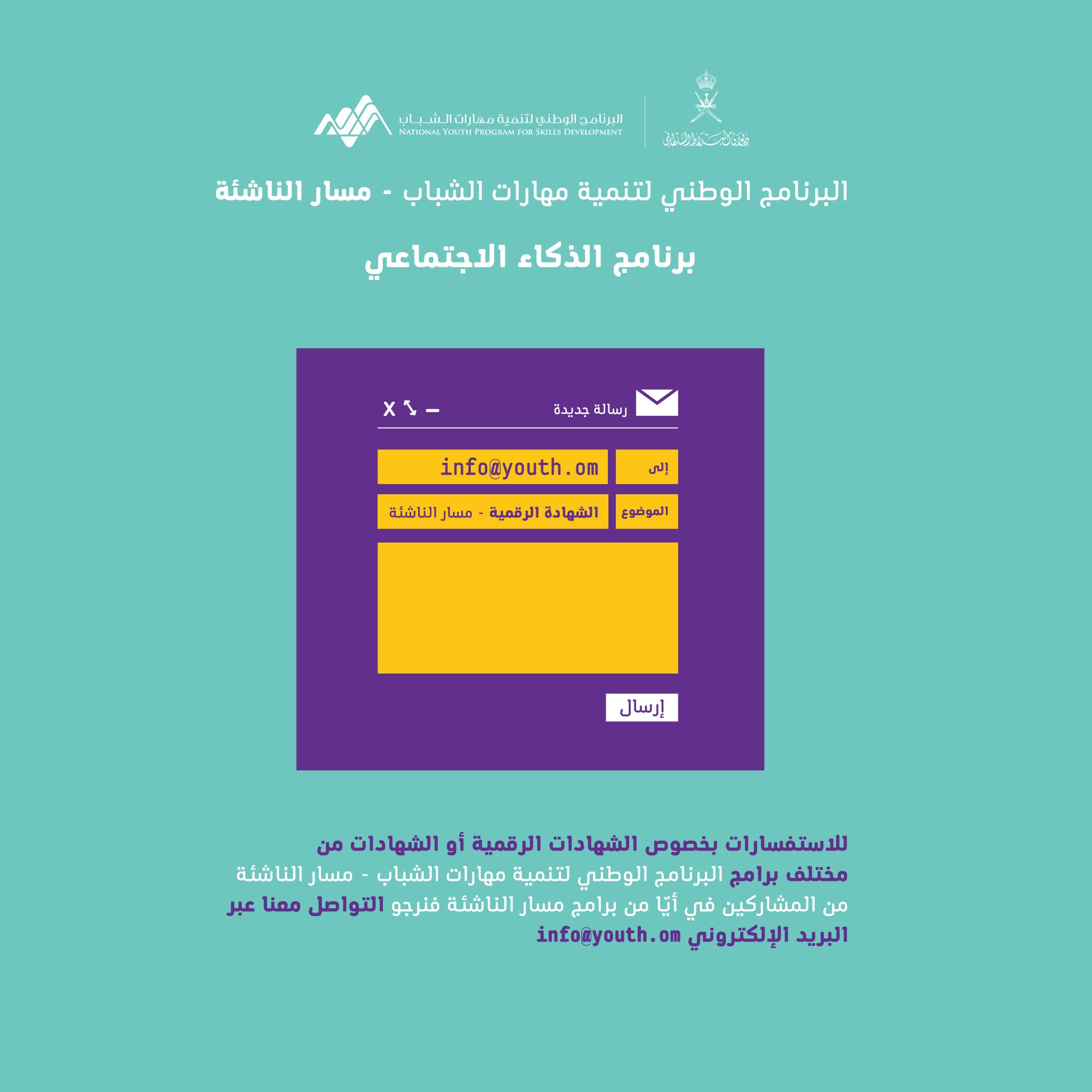 البرنامج الوطني لتنمية مهارات الشباب On Twitter لأية استفسارات متعلقة بالشهادات الرقمية لبرنامج الذكاء الاجتماعي أو في حالة عدم تلقيها عبر البريد الإلكتروني الم سجل لدينا أو شهادات باقي برامج البرنامج الوطني لتنمية مهارات الشباب مسار الناشئة