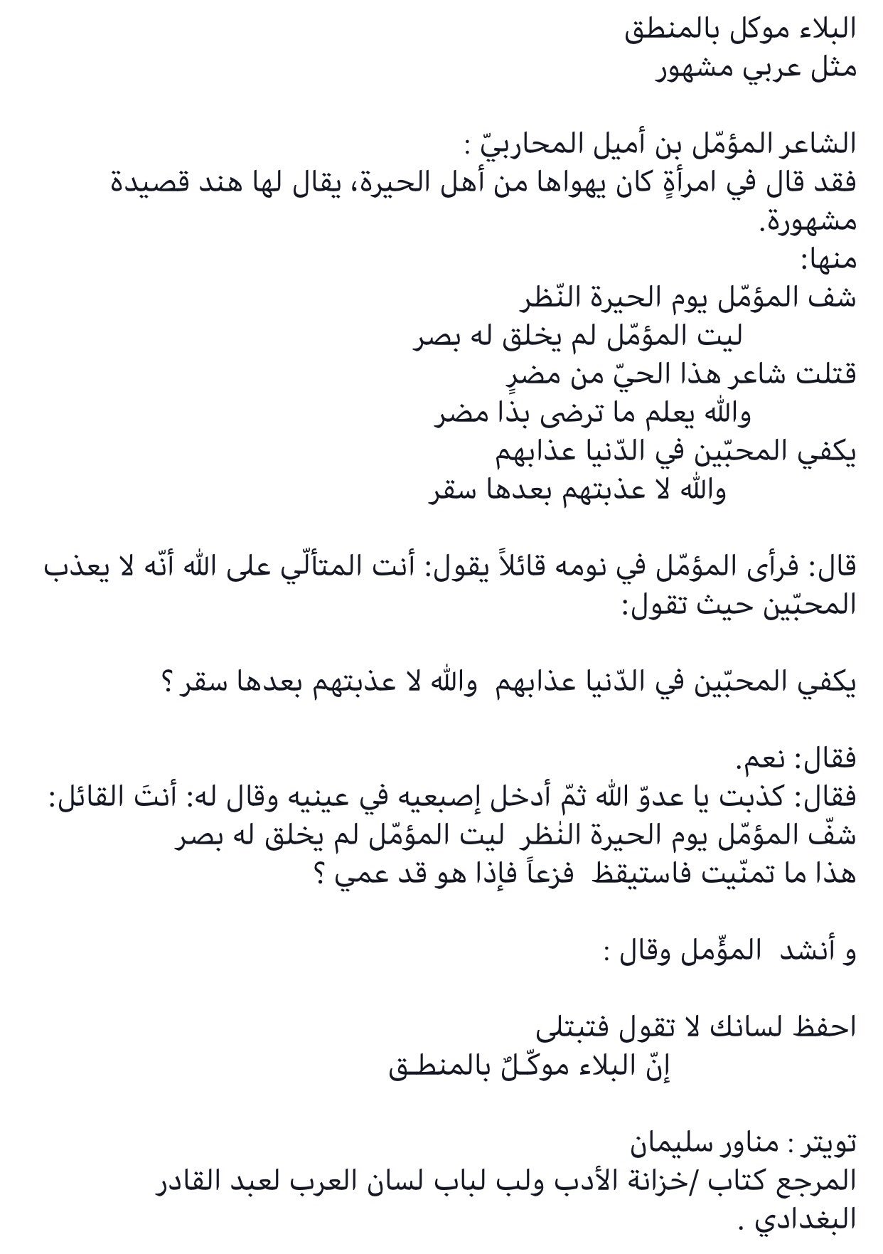 البلاء موكل بالمنطق بعض الناس يقول إذا تكلمت بالشر يحصل كأن تقول امرأة وأولادها صغار لن أزوج بناتي بل سأبقيهن عندي وهي لا تقصد ذلك ولكن من باب كثرة الكلام أو لتبين للناس أنها غير مهتمة إن جاءهن خطاب أم لا وعندما يكبرن. إن البلاء م وك ل بالم نط ق مث ل من أشهر الأمثال العربية من تراثا العربي الأصيل وصاحب مقولة هذا المث ل سيدنا أبي بكر الصديق رضي الله عنه وسنروي قصة المث ل كما وردت في التراث العربي كالتالي. ـ إن البلاء موكل بالمنطق.