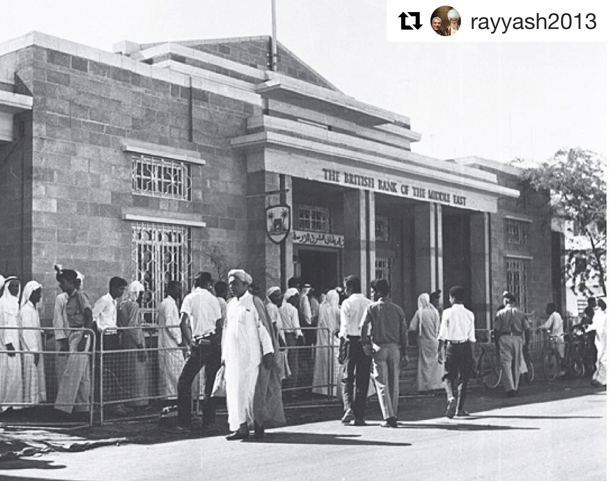 يوسف الجمري Twitterren البحرين عام ١٩٦٥م طابور المراجعين أمام البنك البريطاني للشرق الأوسط في العاصمة المنامة حيث تتم معظم المعاملات بالخردة مو بالانواط قبل وصول ماكينات الصراف الآلي Trayyash