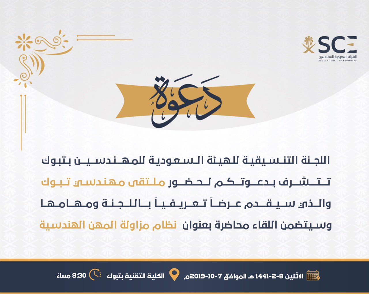 O Xrhsths الهيئة السعودية للمهندسين Sto Twitter يسر اللجنة التنسيقية لـ هيئة المهندسين بتبوك دعوتكم لحضور محاضرة نظام مزاولة المهن الهندسية المقامة ضمن ملتقى مهندسي تبوك Https T Co Ty3erulspo