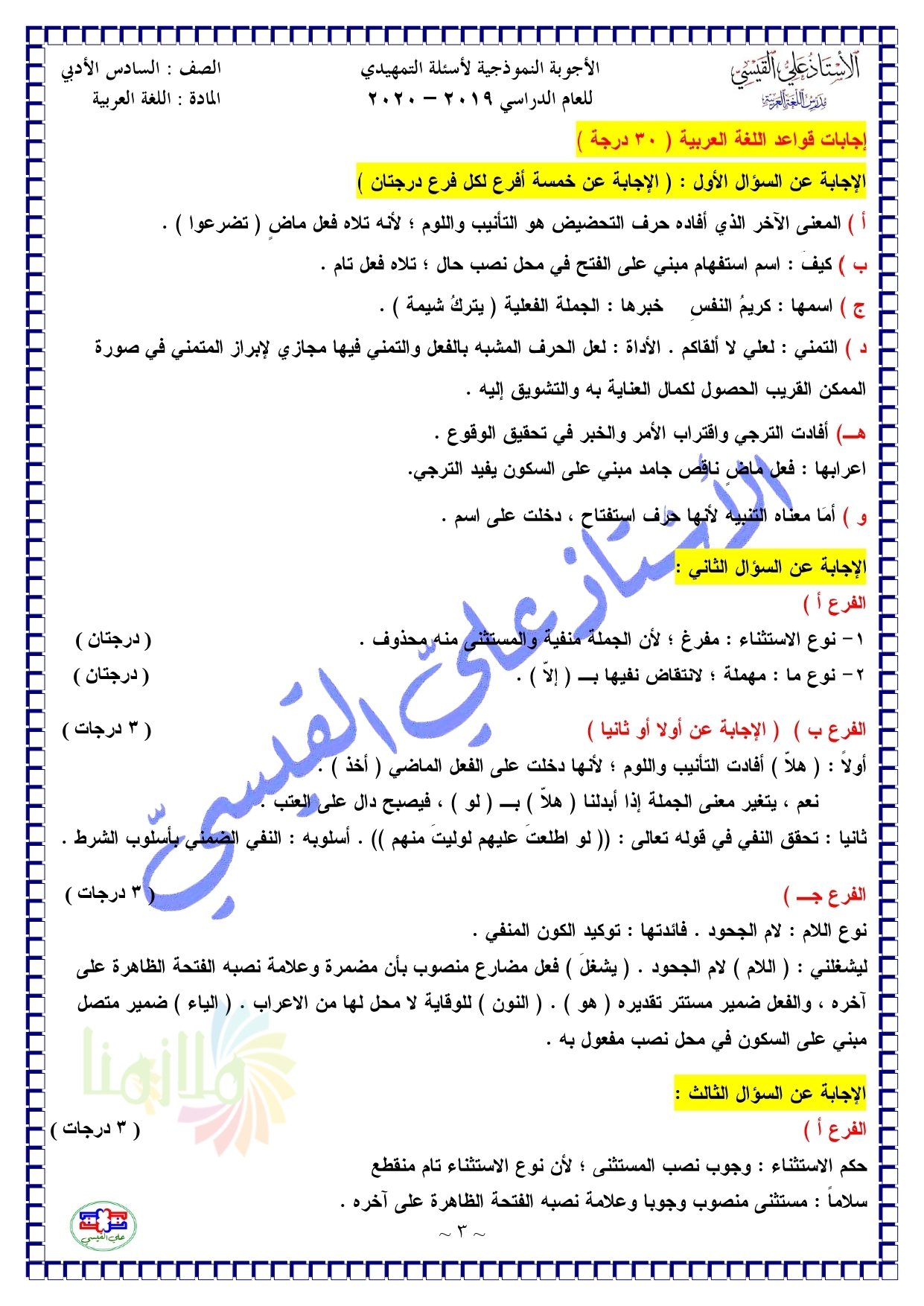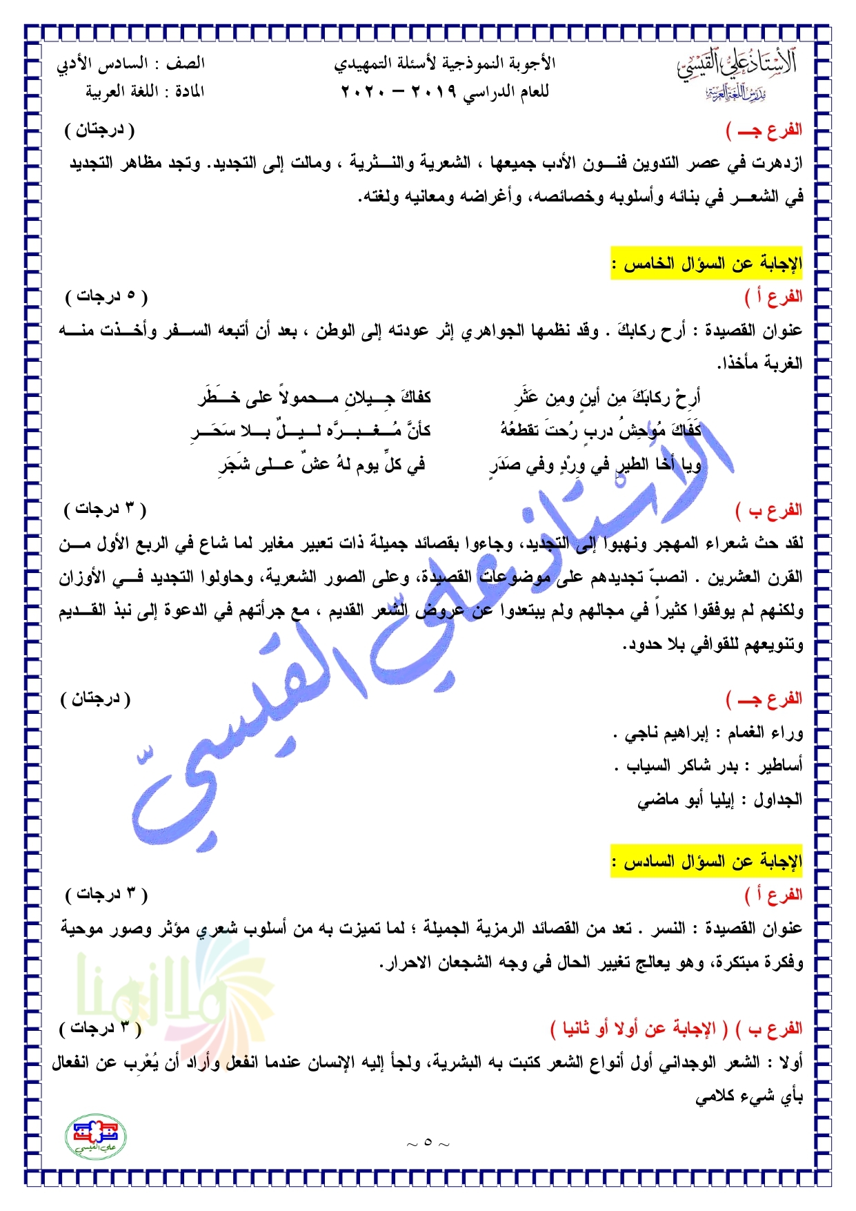 اجوبة عربي سادس ادبي 2020 الخارجي اللغة العربية التمهيدي وزاري