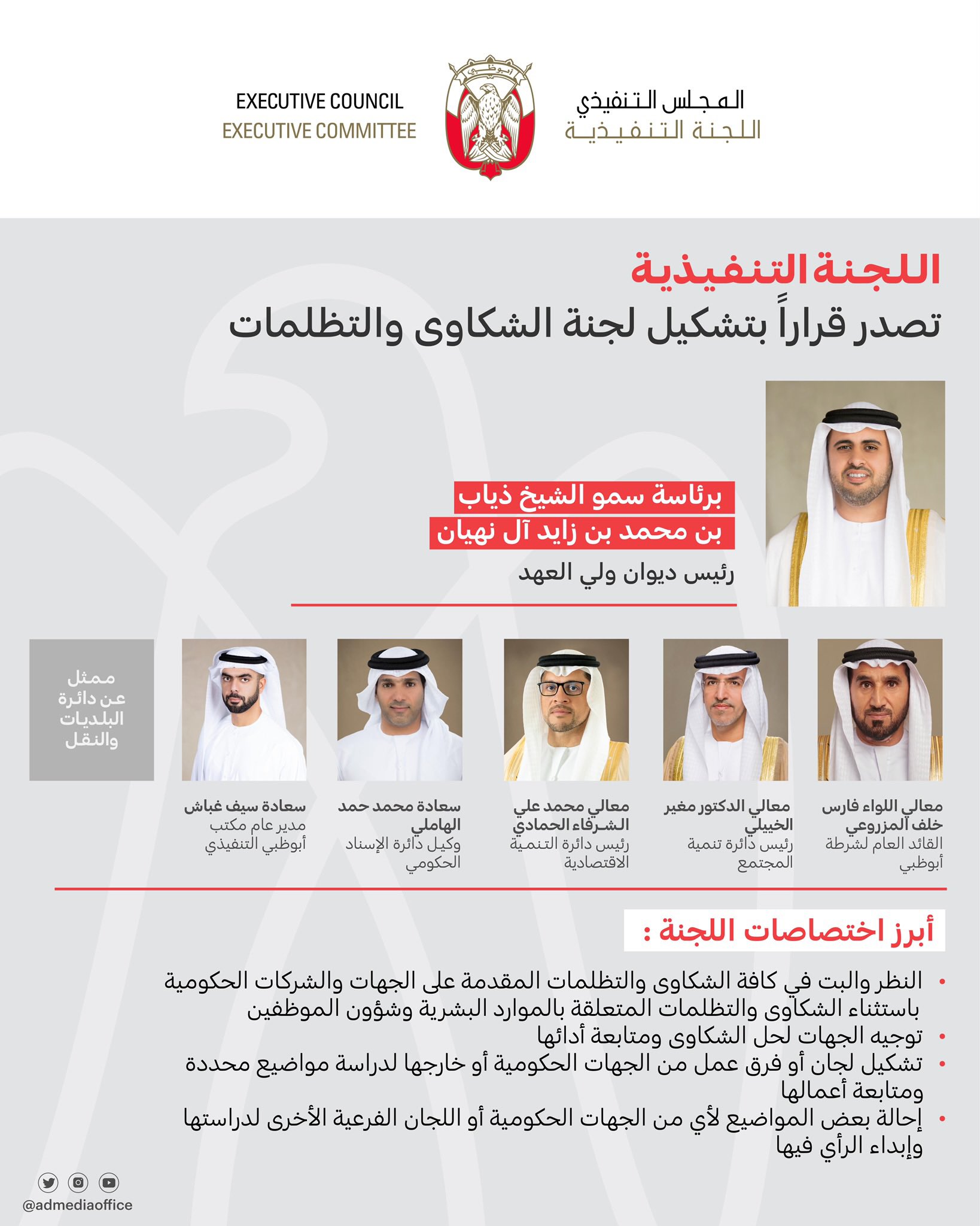 مكتب أبوظبي الإعلامي On Twitter أصدرت اللجنة التنفيذية التابعة للمجلس التنفيذي لإمارة أبوظبي قرارا بتشكيل لجنة الشكاوى والتظلمات برئاسة ذياب بن محمد بن زايد Https T Co K6mmnoabqb