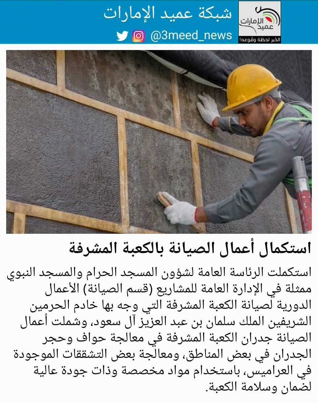 شبكة عميد الإمارات On Twitter استكملت الرئاسة العامة لشؤون المسجد الحرام والمسجد النبوي ممثلة في الإدارة العامة للمشاريع قسم الصيانة الأعمال الدورية لصيانة الكعبة المشرفة التي وجه بها خادم الحرمين الشريفين الملك